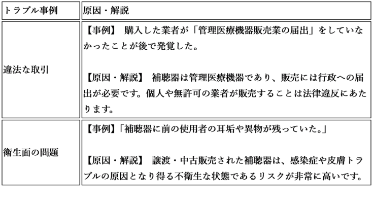 また、昨今インターネットオークションやフリマアプリなどで中古補聴器が安価に出回っています。しかし、安易な購入は法的・健康的なリスクを伴います。