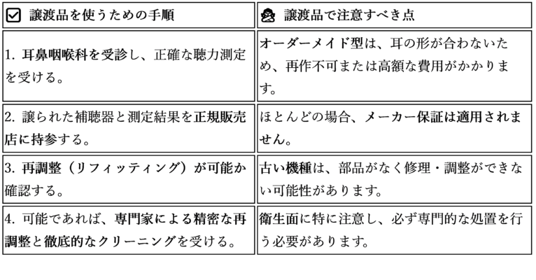 - 中古で入手した補聴器は、以前の使用者の聴力に合わせて調整されています。他人の調整がされた補聴器を使用することは、大きな音で耳を傷めるなど、聴力にとって危険を伴う可能性があります。